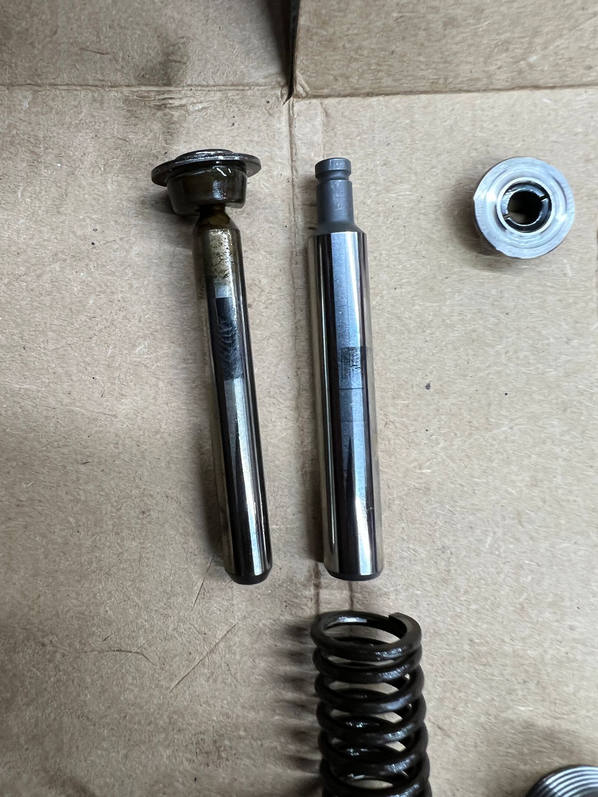 With rigorous testing behind this product, we have determined that a consistent diameter piston is absolutely necessary. Many other upgrade kits available use a piston that steps down to a smaller diameter. They do this because it allows them to use the original seal and nut assembly. However, doing this means that less than 1/2 of the cylinder is guiding the pin at the top of the stroke. This greatly increases wear, leakage past the pin, and decreases the stability of the pin riding in the cylinder. Additionally, using a stepped cylinder causes a pumping action on the bottom side of the piston, which pulses fluid against the shaft seal, increasing the possibility for leakage into the cam follower region. With our consistent diameter piston, as with factory design, there is no displacement change occurring on the bottom side of the piston, so there are no pressure pulses against the shaft seal.